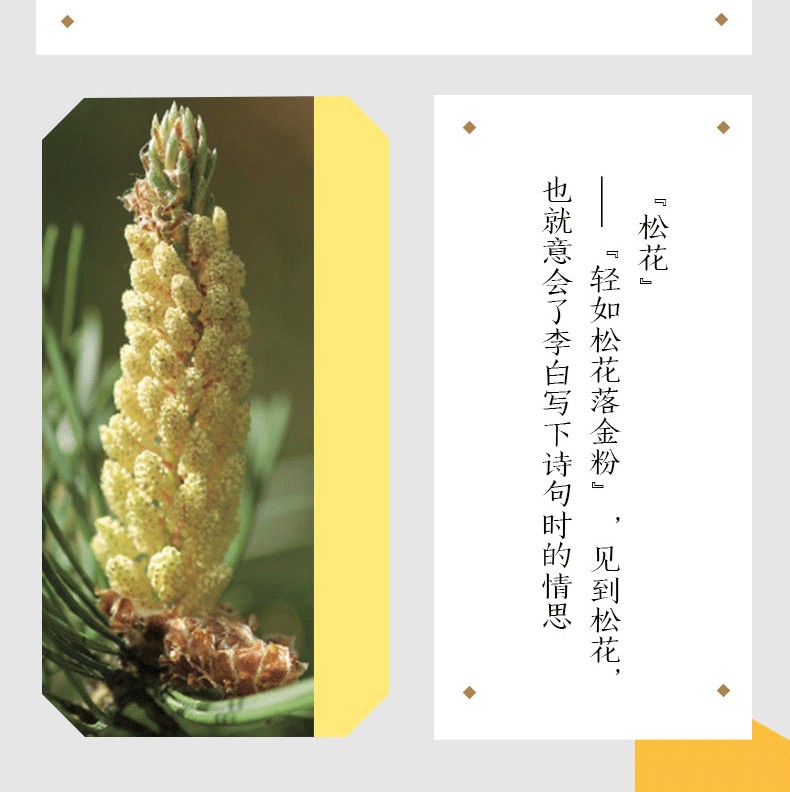 我因為“松花”而困惑過,這是還在使用的色名,但如果不去還原實物,“松花”的顏色是撲朔迷離的:在網上查到的松花色,有黃中帶綠的,還有淺綠色的。我在查證松花色時,遇到擅用松花粉做滋補品的專家,她說:“抖落的松花粉像嬰兒膚色一樣嬌嫩。”然後,看到松花的實物,它是松樹雄枝春天抽新芽時的花骨朵。回到事物的起點,這是有說服力的,松花是嫩。打撈起來的色名,要還原為天地萬物、衣食住行,才能知其所以。