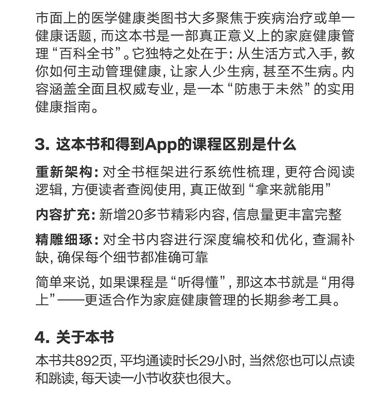 文本特色 簡單易懂,搭配翔實的數據,具有較強的可讀性與參考性。 2.裝幀特色 精裝雙封,設計精美。封面採用特種紙,內封觸感膜+燙金工藝,十分有分量。 3.現實意義 為提升家人健康水準、促進全民健康提供有效且實用的參考。