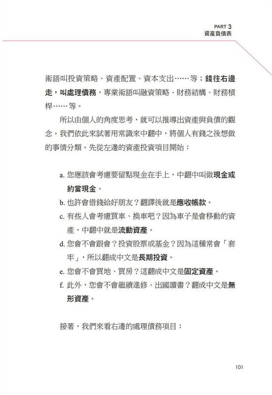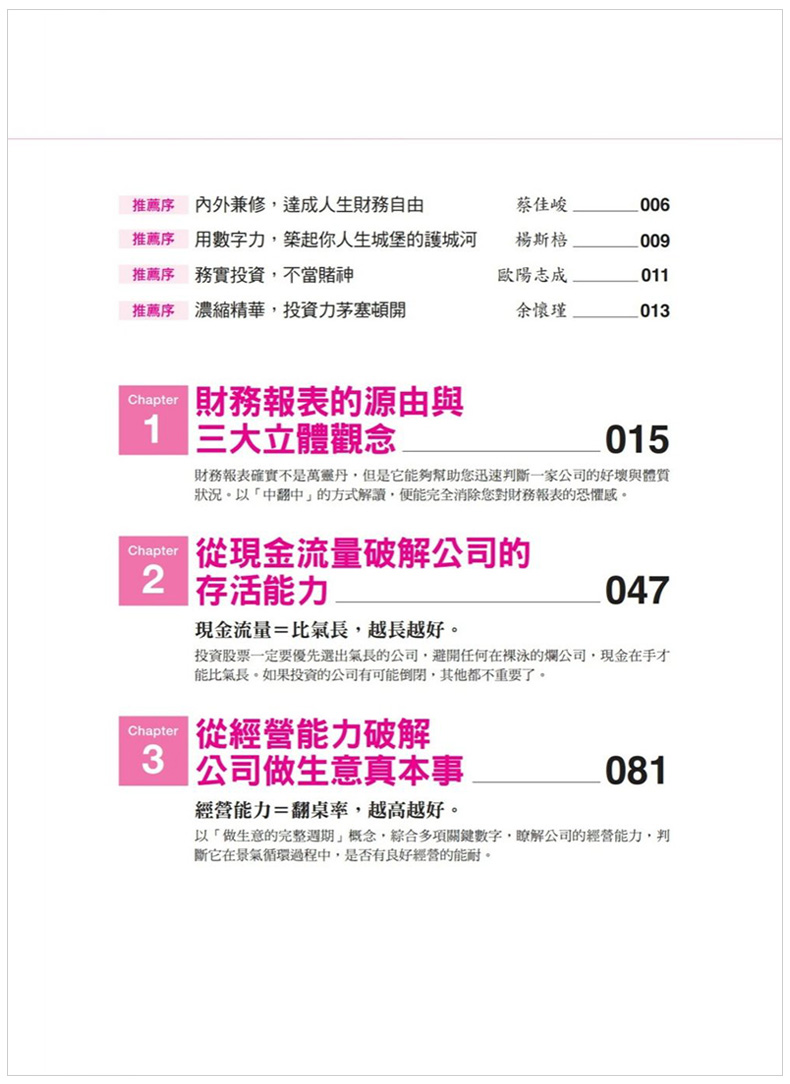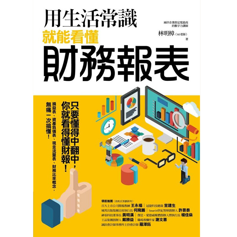 財務報表是一種語言學,難的是中翻中。中英夾雜的專有名詞看似複雜,其實靠常識就足以理解,不必辛苦死背定義。你無須鑽研艱深數字與公式,只要運用個人生活中的財務思維,就能推導出公司經營的各種關鍵資訊,看穿投資密碼!