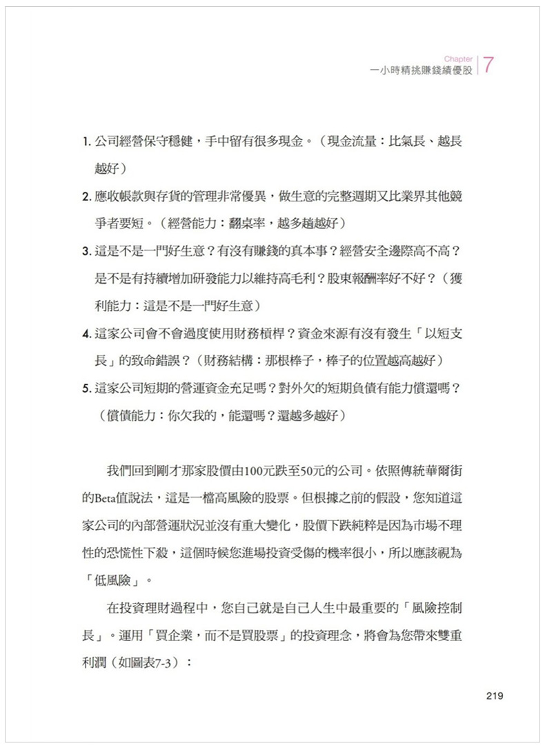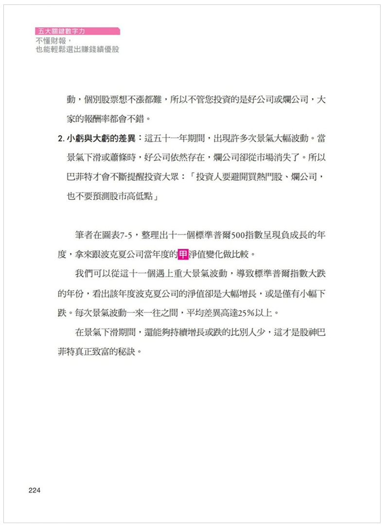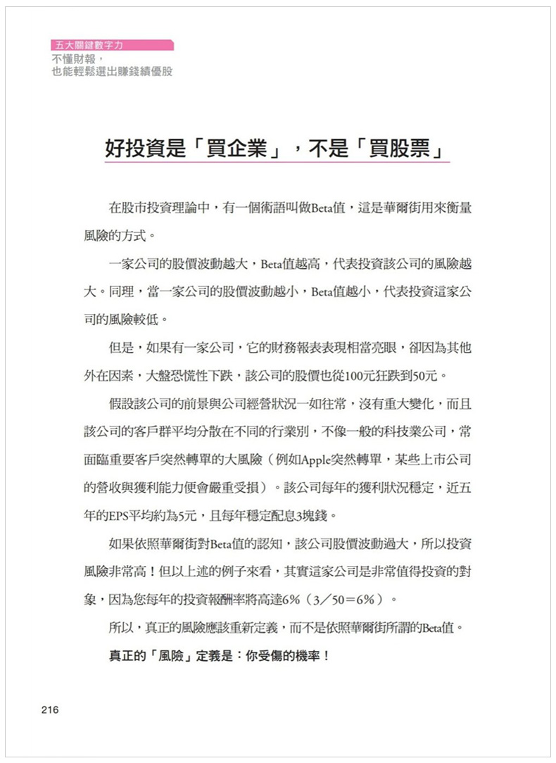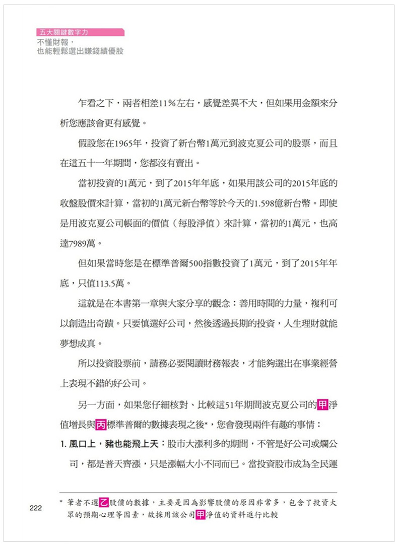 巴菲特不斷提醒投資者,不要投資沒有生產力的公司。而一家公司是不是一門好生意,是否有賺錢的真本事、長期穩定的獲利能力,以及面臨景氣波動仍能撐下去的健康體質,其實都可以從財務報表裡面解析出來。當你瞭解損益表、資產負債表、現金流量表的閱讀技巧,再搭配公開資訊觀測站的五大財務比率分析,就能快速找出值得投資的公司。